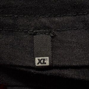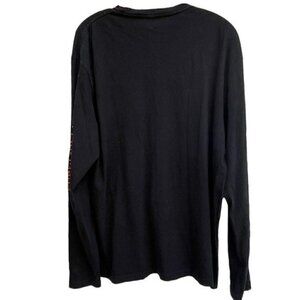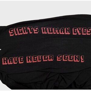 PREOWNED AND IN GOOD CONDITION minus cracking on red graphic- see pics. Classic XLARGE brand black long sleeve pullover t. Graphic on both arms: Sights Human Eyes Have Never Seen.