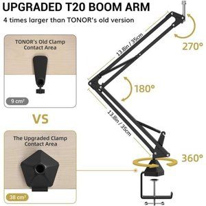 🧿Upgraded T20 Boom Arm: T20 is made of durable steel and comes with a desk clamp with 4 times larger contact area for easily clip to any desk up to 2.4''/60mm thick, suitable for most mics weighing up to 4lbs/1.8k.