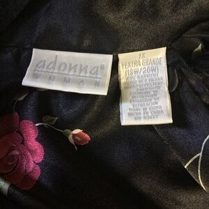 Questions? Leave a comment below! Beautiful vanity fair it’s black with the gorgeous rose flowers. It is a size XL polyester made in Pakistan. The length on it is an approximate measurement of 34 inches sleeve length is 9 inches. 24 inches pit pit covered black satin buttons just absolutely beautiful. It’s a V-neck. The button is beautiful to wear. You can even wear it open and wear something underneath it like black lounge pants positively beautiful the vanity fair makes gorgeous gorgeous items.