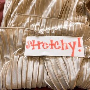 elegant Champagne beige dress is sleeveless with a pleated design throughout. The size is extra large and stretchy, making it comfortable to wear. Perfect for formal events or special occasions, this dress is versatile and stylish.