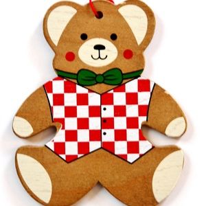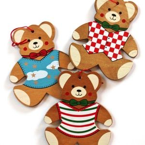 Darling set of 3 wood vintage Christmas Teddy Bear ornaments! These remind me of the "Gingerbread Man Teddy Bear" ornaments! Stained luan wood with Christmas decals placed on top.