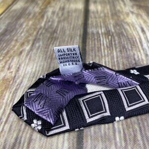 Elevate your style with this XMI 100% silk neck tie made in the USA. The black geometric daisy print adds a touch of sophistication to any outfit. This tie features an adjustable pointed style and a classic length (57"-60") and width, making it a versatile addition to your wardrobe. The tie is crafted from high-quality woven fabric and is perfect for any occasion.