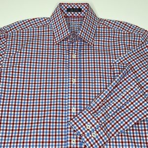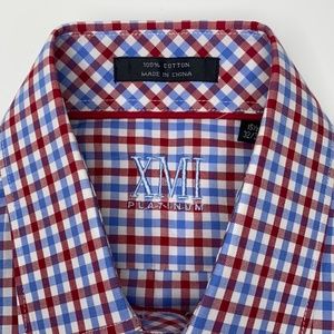 Handsome XMI Platinum 100% Cotton dress shirt, light blue and red gingham, long sleeve, pearlized buttons, extra buttons on inside on front button placket, logo is embroidered on inside of back yoke, single front pocket. Shirt length is 32.5, pit to pit is 22 and sleeve length is 23.5. Shirt size 15 1/2. Pre-owned in new condition.