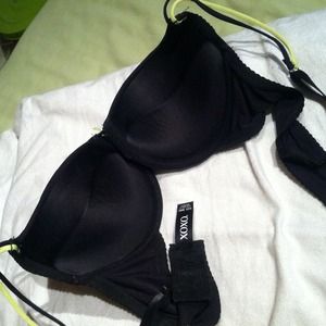 Sexy black push-up with lime green accents and rhinestone detail. "Adds 2 cup sizes!" Barely worn.