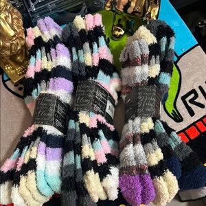 Step into comfort with XOXO's casual socks, featuring a stylish black and gray striped design. Crafted from a soft, fuzzy material, these socks are perfect for lounging and keeping your feet cozy. The elastic cuff ensures a secure fit, blending style with functionality.