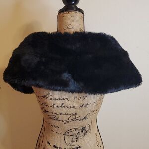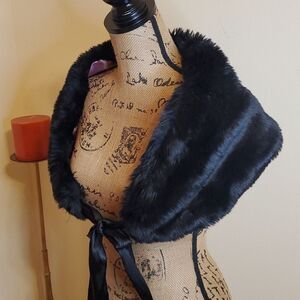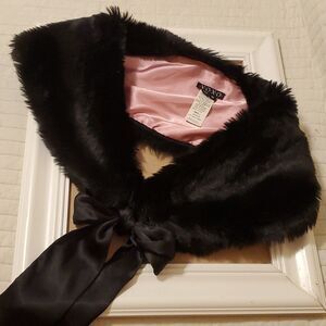 XOXO Black faux fur wrap, pink satiny lining, black satiny ribbon tie. Excellent pre loved condition, measurements in pics, smoke free home, ships next day. Over 2,500 Poshmark Sales. Bundle and Save!