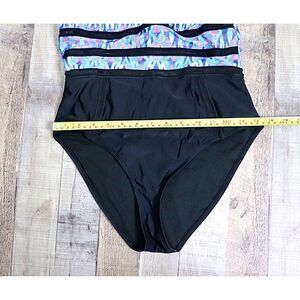 XOXO Sweetheart Blue Geometric Novelty Trim 1pc Swimsuit sz MEDIUM. Shelf bra with soft padded cups. Moderate Coverage. Fabric 82% Nylon, 18% Spandex. Hand wash only for the longevity of the suit.