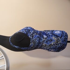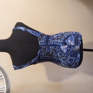 This XOXO camisole features a striking blue and black pattern with a fitted silhouette and stylish cut-out details. The sleeveless design and tank-style straps make it a versatile top for any occasion. Its vibrant colors and unique style elements ensure you stand out effortlessly.