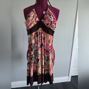 XOXO Brown Paisley Backless Halter Mini Dress. Size MED. Chic backless design with vibrant floral patterns. Perfect for summer outings. Excellent pre-owned condition