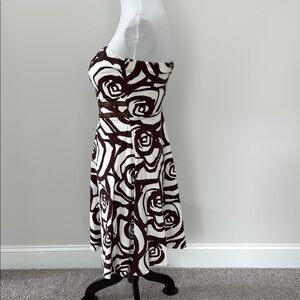 This chic strapless dress showcases a sophisticated blend of brown and white hues, offering a sleek and modern look. Its strapless design ensures a flattering silhouette, making it a versatile choice for various occasions. Please view all of the photos.The zipper is slightly worn and can be tough to zip but it does zip all the way. If you can replace there zipper there is still a lot of wear in this dress.