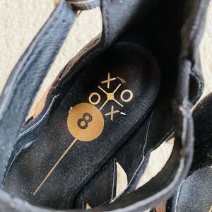 XOXO Dressy Sandals US size 8M in Black & Multi Color faux suede. These are strappy high heel shoes that will work dressy or more casual. Adjustable ankle strap buckles - there is also a faux zipper at the heel backs. Stunning high fashion look that will add a pop of color to your Little Black Dress! Gently worn - no flaws - these could be mistaken for brand new.