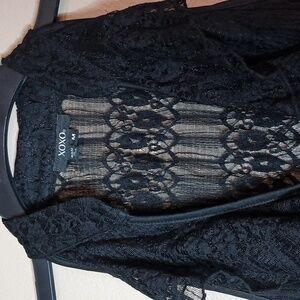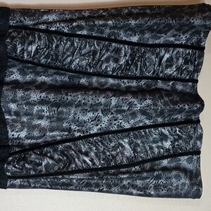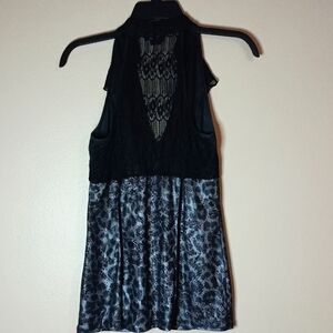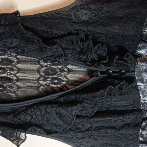 Very Cute and Sexy XOXO Leopard and Lace Top with Ruffles and Button Detail on the Lined Front. Ruching Detail Trimmed in Black Velvet Ribbon on Front and Black Velvet Ribbon on Back. Excellent Like New Condition.