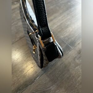 Elegant XOXO shoulder bag with monogram pattern. Features black accents and a sleek design. Ideal for everyday use.