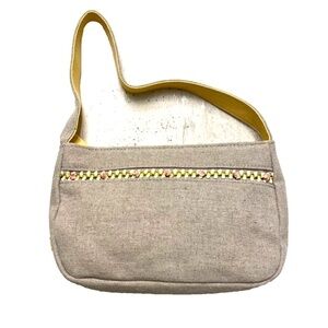 XOXO New York Vintage Y2K Mini Linen Blend Purse; Tan w/ Floral Trim; Yellow Int