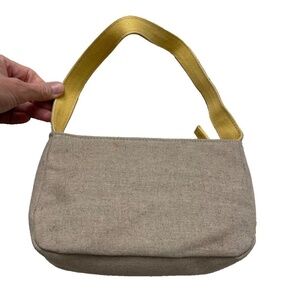 This XOXO New York vintage Y2K mini purse is a must-have for fashion-forward women! The exterior is made of a stylish linen blend in a beautiful tan color with delicate floral trim, while the interior is lined with a vibrant yellow color. The satchel/top handle bag style is perfect for everyday use and the yellow linen blend handle/strap material adds a pop of color to the overall design. This purse is branded with XOXO and is perfect for women who love unique and fashionable accessories. Bag is in excellent, pre-loved condition!