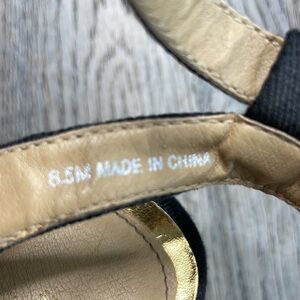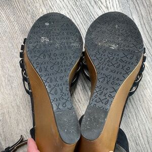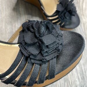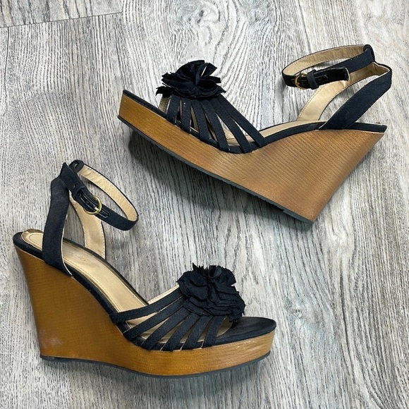 XOXO Platform Wedge Sandal, black Canvas with Canvas flower, size 8.5 in great used condition. Such cute shoes!!