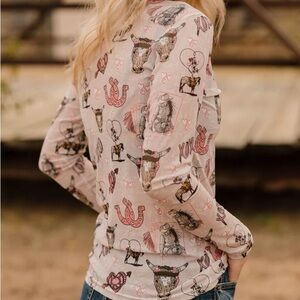 Stretchy mesh top with rodeo Valentine print.