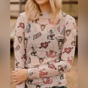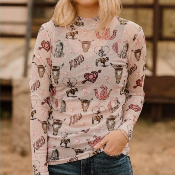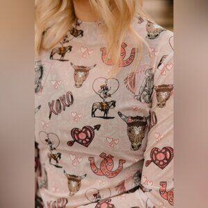 Stretchy mesh top with rodeo Valentine print.