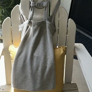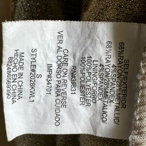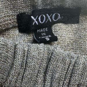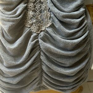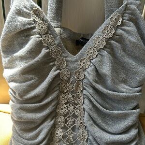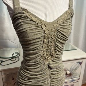 This taupe top by XOXO has gold metallic threads running throughout. It has thin straps that cross and connect in the back and a V neckline and a lace appliqué that follows the neckline and runs down the entire front. On each side of the lace there is thick ruching. Such a cool top in a size small.