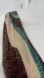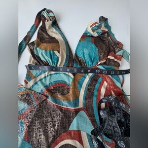 Vintage multicolor V-neck pull on sleeveless dress featuring a bold pattern and an elastic Wide belt. Perfect for any occasion. Excellent pre owned vintage piece. Midi in length, sleeveless, pull on with tie at the neck. Bold design in brown and blue colors, has shiny gold throughout. Built in bra!