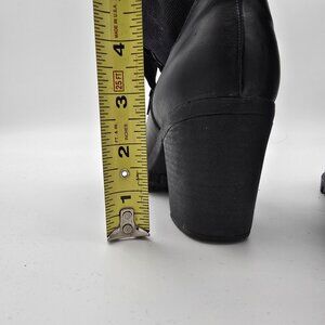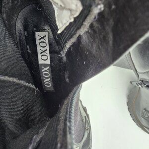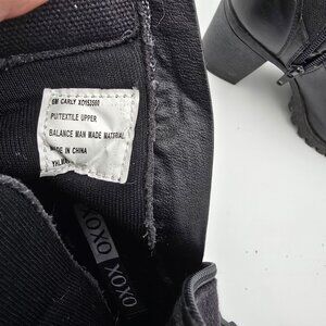black ankle boots, lace-up boots, XOXO boots, women's boots, chunky heel, fashion footwear, faux leather, textile boots, side zipper, ankle shoes, size 6 boots, made in China, stylish boots