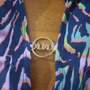 XOXO Womens High Neck Deep V-Neckline Plunging Front Crisscross Cutout Sides Open Back One Piece Swimsuit Multicolored Zebra Print Gold Logo Medallion Hardware Size Medium, Please See Measurements For Best Fit, Nice NWT Condition!
