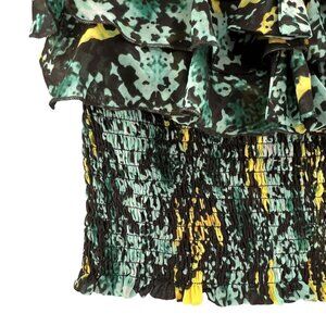 This top might just be your new wild card in the fashion jungle! With ruffles that say "I'm fun!" and a print that whispers "I'm unique!", it's hard not to stand out. Plus, the smocked bottom means you can eat that extra taco without a care.