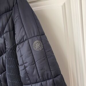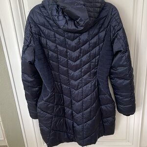 XOXO midnight blue long puffer quilted fitted hooded raincoat jacket sz Large