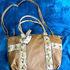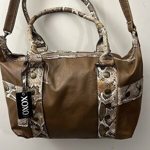 XOXO shoulder handbag tik tak vinyl color tan. Small scratch on the back. Look closely at the pictures! Bronze buttons on the front on inside of purse pockets on both sides one side zips. New never taken! Measures 16 inches across 11 inches top to bottom, 2 1/2 inches wide.