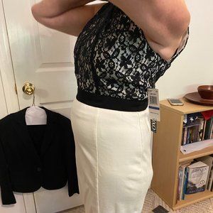 XOXO, in juniors 9/10, black and cream dress. Top is a beautiful black lace over a cream sleeveless top and a cream skirt area. Fabric is rayon, spandex, nylon. Fully lined. New with tags. Purchased for wedding.