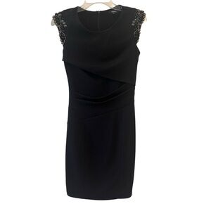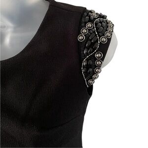 The capped sleeves flatter the arms. Black, muted silver embellishments add an edgy touch