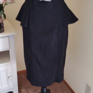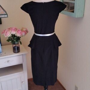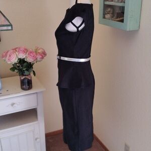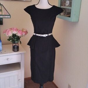 Simple and elegant, this black dress has stretch. Cap sleeves. Fitted everywhere. Princess seams front and back. Peplum at sides. I've added a silver belt, not original to the dress, but I think it works. Size 9/10 measures 36 at chest, 28 at waist, 36 at hips. 34 at bottom hem. 41 long from shoulder to hem. All measurements have some stretch. On the right person, this dress will be an elegant statement.