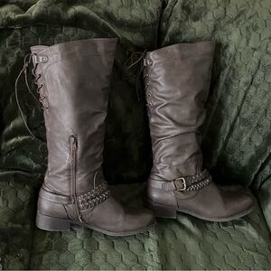 Showcase your refined style with the Mallory riding boot from XOXO. These tall boots feature back corset lacing and a braided buckle at the ankle for a bit of western flair.