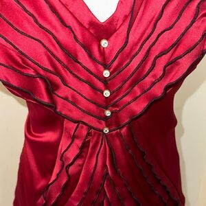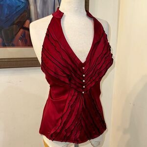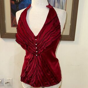 This sexy silky piece features a stylish ruffled design with delicate button accents. Perfect for a night out or a special occasion. The fit really enhances your figure. Definately a head turner. Excellent like new condition!