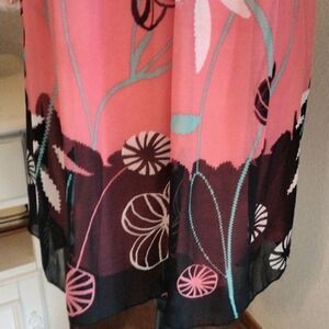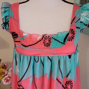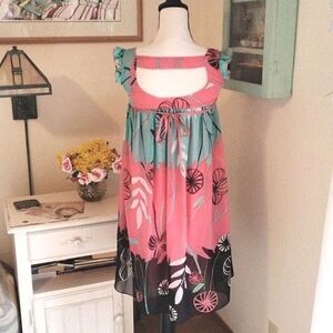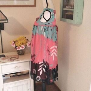This dress is pretty and unusual. The top lies at the top of the chest or pulled a little lower on the chest, see photos. Ties to the back. Straps with ruffles, elastic shirring at chest front. Strap across back. Semi-sheer abstract floral over full lining. Size M measures 32 at chest ( under arms) full under chest. 36 long from shoulder to hem. Slightly longer in back. Fun and perfect for now.