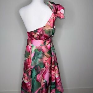 Brand new with tags! Stunning one-shoulder pink and green floral midi dress by XPLUSWEAR. Features a ruffled shoulder detail, waist tie, and a flattering A-line silhouette. Perfect for weddings, brunch, or summer events. Size XL – fits true to size. Never worn.