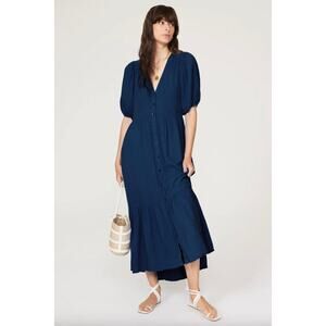 Blue cotton (100% Cotton). A-line. Short sleeves. V-neck. Pull on. 47" form shoulder to hemline. Made in the USA of imported fabric.