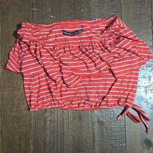 XS Abercrombie Coral and White Striped Off-Shoulder Crop Top Ruffle Y2k