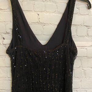This is an amazing dress, with sequin detail (they are black - the light reflects and shows some yellow, but they are black). Soft, light elegant material. Linning is light black. It contains 5% elastane, so molds the body really well. Excellent choice for a formal event.