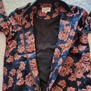 XS Frank and Oak Jacquard Floral Bomber Jacket Pink Navy Blue Embroidered Roses