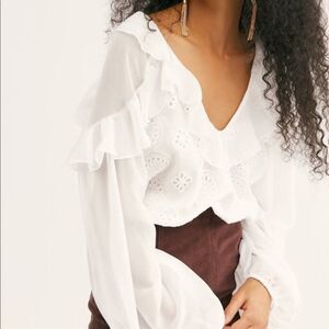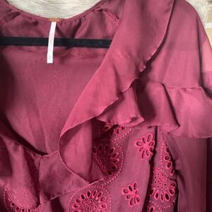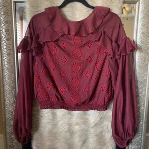 Like new. size xs. Free people burgundy maroon chiffon top with ruffle v neck and shoulders. Embroidered flowers on the front. Big flowy sleeves.