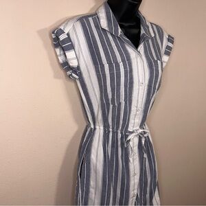 XS Japna Blue/Slate Grey Striped Dress Retro Short Sleeve Button Front Cotton