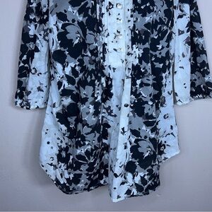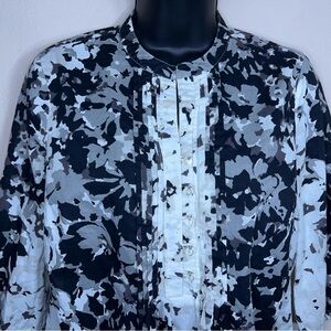 XS LIZ CLAIBORNE BLACK GREY WHITE FLORAL BLOUSE BEADED 3/4 SLEEVE COTTON
