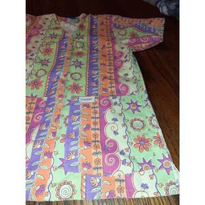 Good Used Condition Women's Size XS Landau Orange, Purple, Pink, Green Floral Snap Front Short Sleeve V-Neck Scrub Top Shirt with Pockets and Side Slits