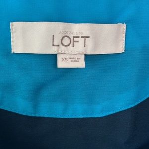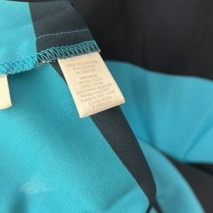 Aqua and navy striped shell; nautical feel, looks great dressed up or down. I wore it with a navy pencil skirt and jeans. Good condition. Color is closest to third picture.