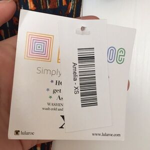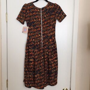 This is a brand new lularoe amelia dress. Still has the tags on it. Dark navy blue background with orange and gold print on it. Zipper back, has pockets. Price firm. Thanks for looking.