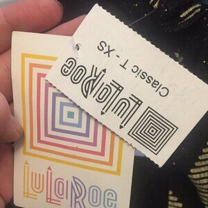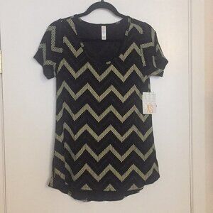 This is a brand new lularoe classic t. It is a short sleeve shirt and is slightly longer in the back. Black with zig zag print on it. It is shimmery. It looks and feels like an elegant, but it is not technically an elegant. Still has the tags on it. Price is firm. Thanks for looking.