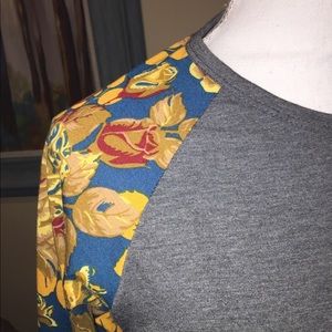 XS LulaRoe Randy with grey torso and deep teal blue sleeves with floral print in beautiful fall colors. Mustard yellow, burgundy, and tans. Worn once.