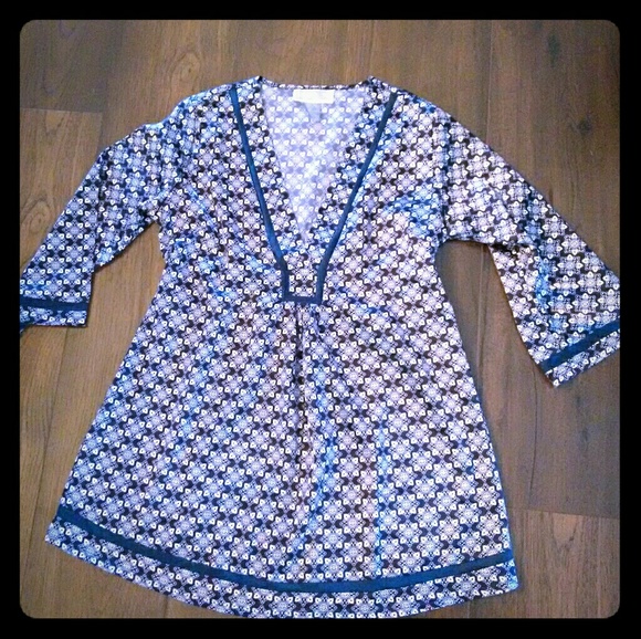 Kimono-style satin maternity blouse from Everly Grey. Size extra small (but seems to run a little big), low V-neck and wide sleeves, super cute tiled pattern with blue piping. Great condition, only worn a few times. I have a matching dress in another listing.