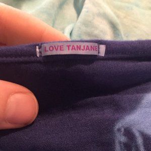 This is a brand new LOVE TANJANE shirt. Soft and stretchy material with ruching design on front and sides. 92% rayon and 8% spandex. 3/4 length sleeves. Measures 17 inches across the bust and is about 26.25 inches in length. Made in southern california and hand dyed in ojai. Price is firm. Thanks for looking.
